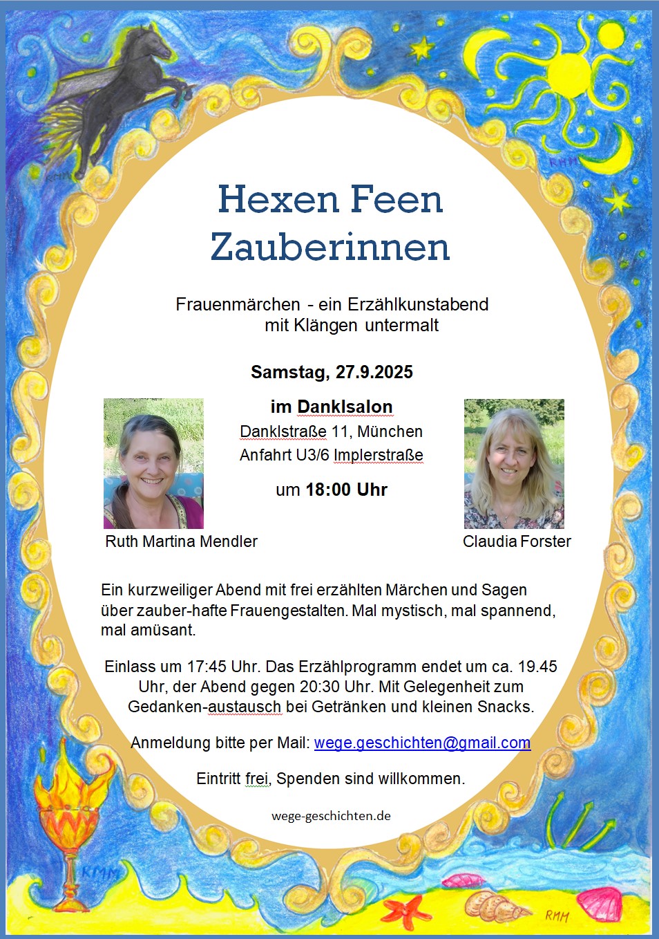 Hexen, Feen, Zauberinnen, im Danklsalon, am Samstag, den 27. September 2025 Ein kurzweiliger Abend mit frei erzählten Märchen und Sagen über zauber-hafte Frauengestalten. Es erzählen