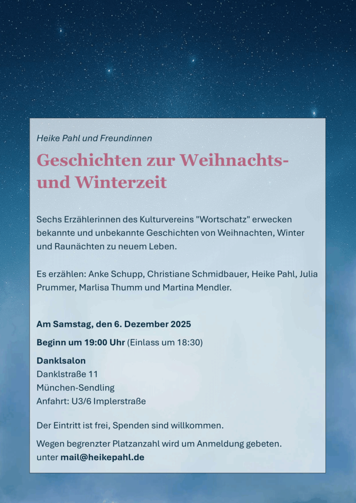 Sechs Erzählerinnen des Kulturvereins „Wortschatz“ erwecken bekannte und unbekannte Geschichten von Weihnachten, Winter und Raunächten zu neuem Leben.